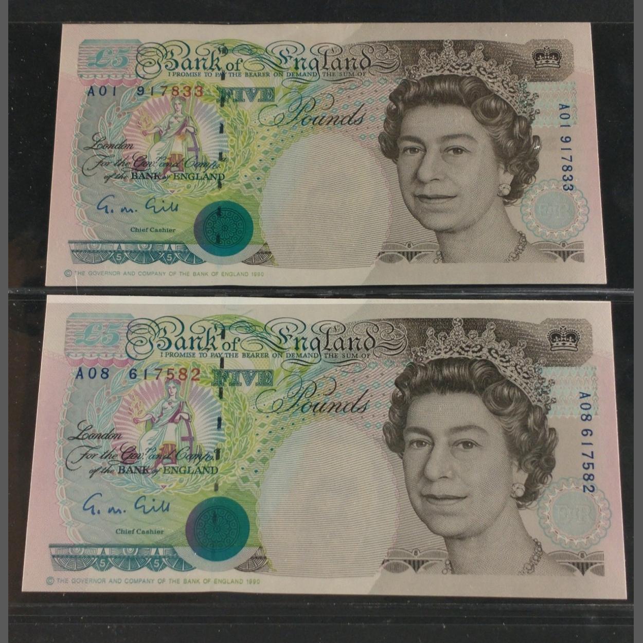 Two green GILL Bank of England five pound notes A01 917833 and A08 617582. Uncirculated condition
