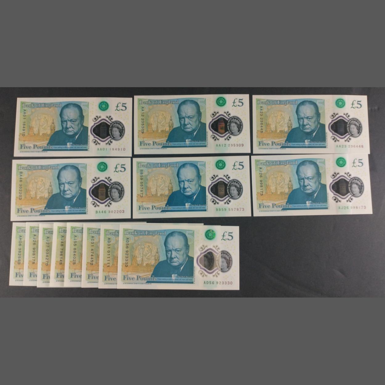 Thirteen blue polymer CLELAND Bank of England five pound notes to include AA01 184910, AA12 235309, AA23 236448, AC31 474452, AD31 011111, AD56 923330, AH06 382590, AJ26 998173, AJ26 998178, AJ27 034270, AJ27 034270, AJ48 796148, AJ55 884025, BA46 302203 and BB59 557873. Uncirculated condition