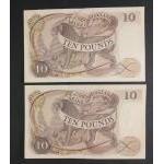 Two large size brown PAGE Bank of England ten pound notes serial nos M01 368360 and M01 841852. Uncirculated condition