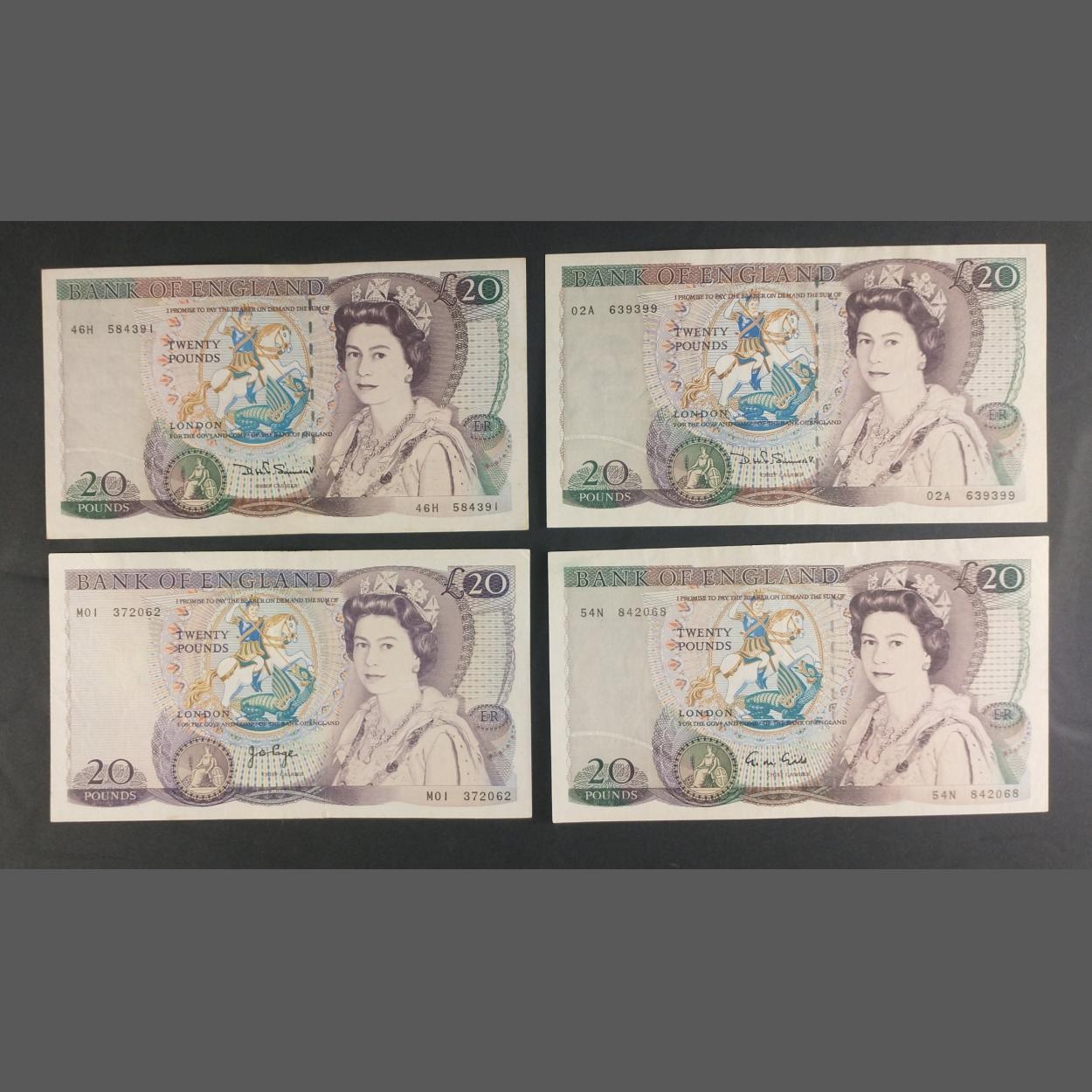 Two purple SOMERSET Bank of England twenty pound notes, one GILL twenty pound note and one PAGE twenty pound note. Uncirculated condition