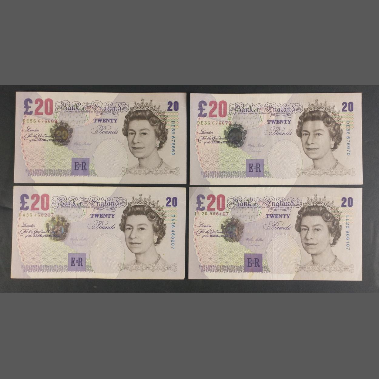 Four purple LOWTHER Bank of England twenty pound notes to include sequential DE56 676669 and 70, plus 2 others. Uncirculated condition
