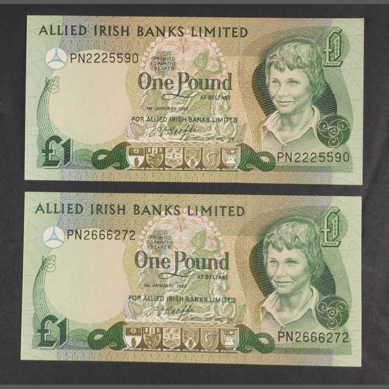 Two ALLIED IRISH BANKS LIMITED one pound notes Jan 1st 1982 PN 2225590 and PN 2666272. Uncirculated condition