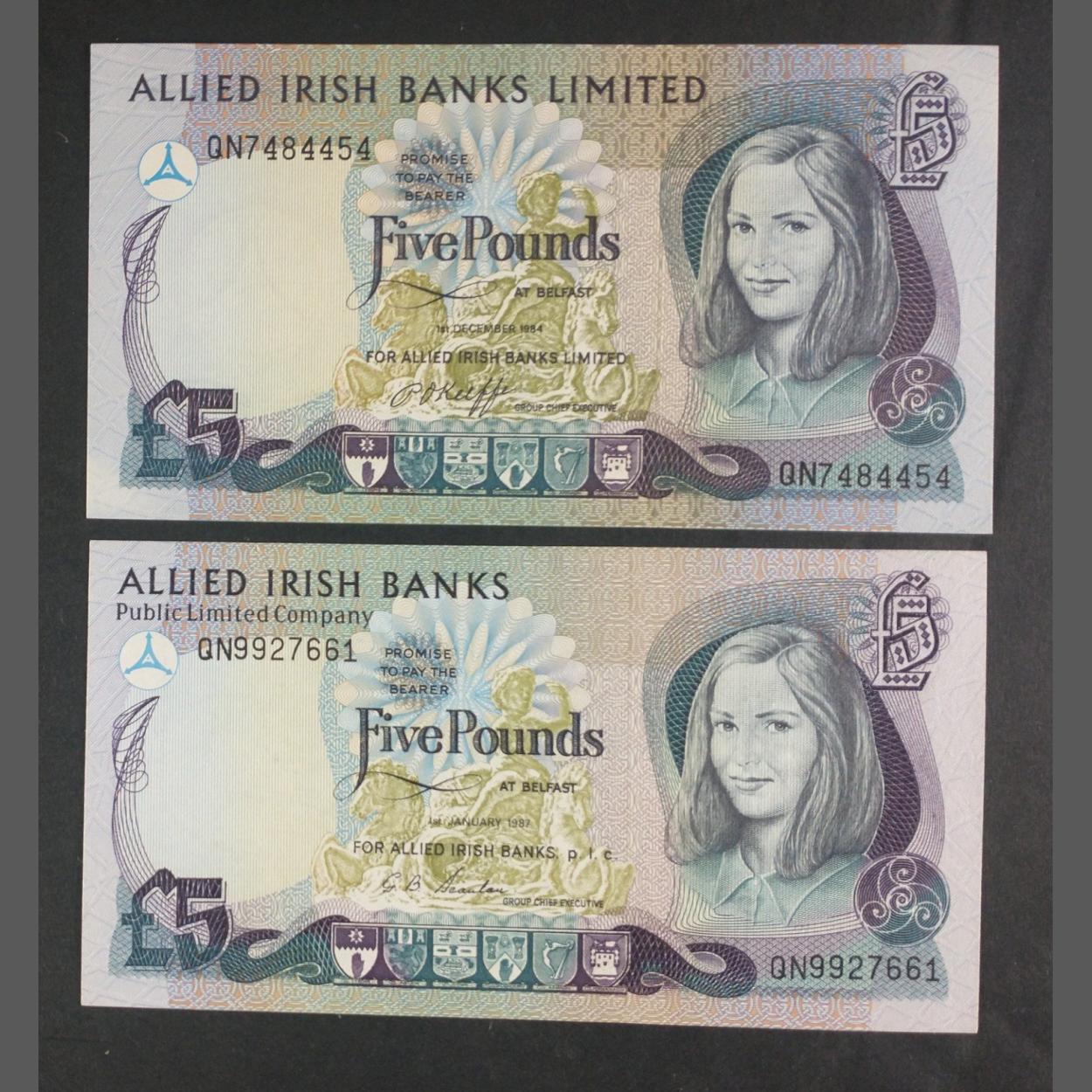 Two ALLIED IRISH BANKS LIMITED five pound notes, serial nos QN7484454 (1st Dec 1984) and QN9927661 (1st Jan 1987) Uncirculated condition