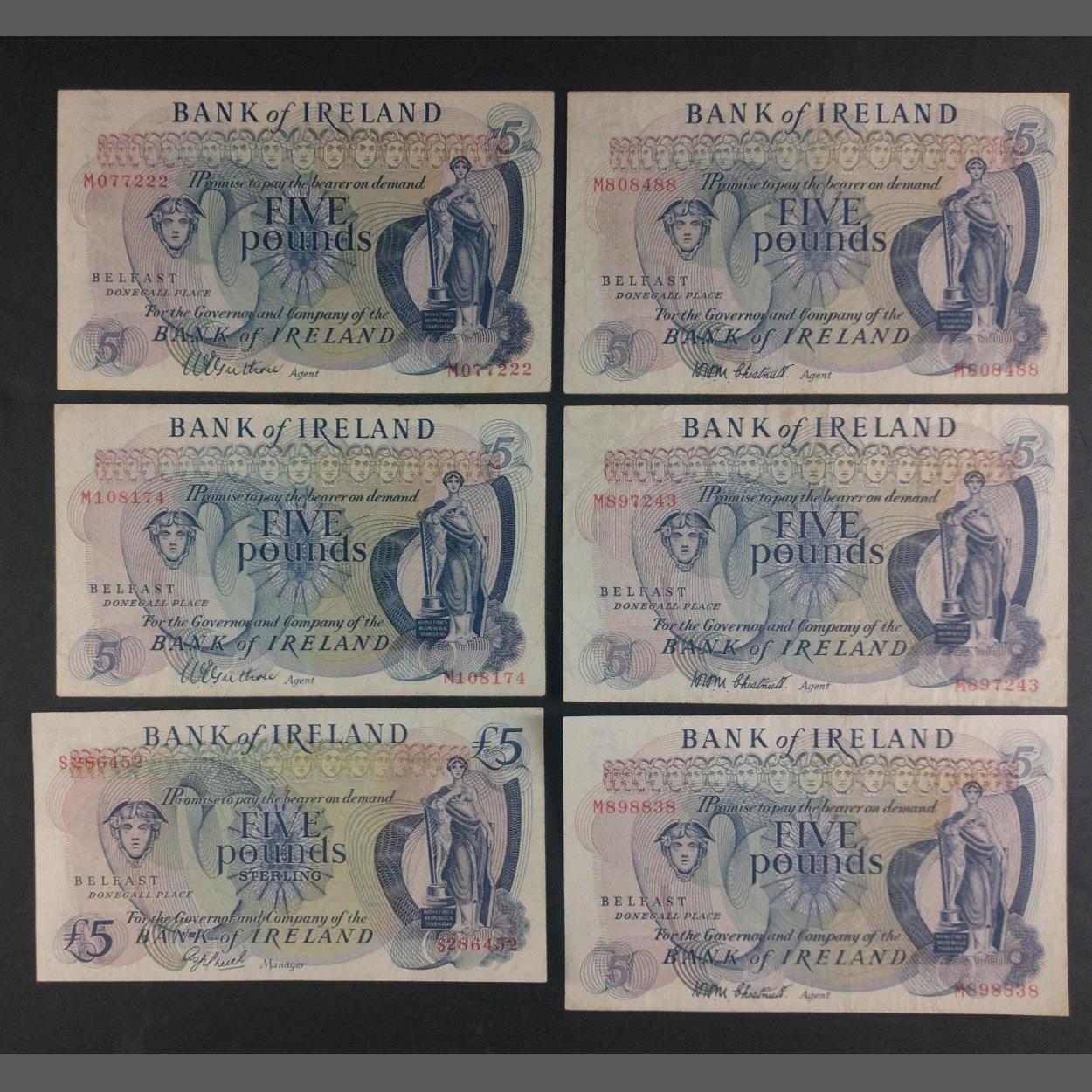 Five BANK of IRELAND five pound notes signed by GUTHRIE (agent) and CHESTNUTT plus one other