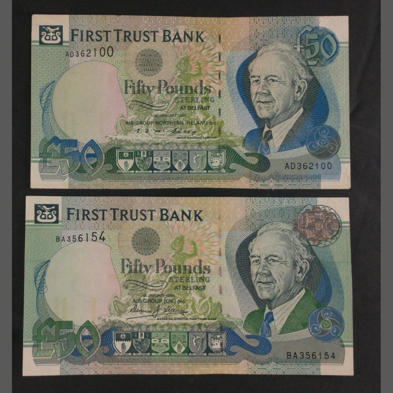Two FIRST TRUST BANK twenty pound notes issued 1994 and 1998. Uncirculated condition