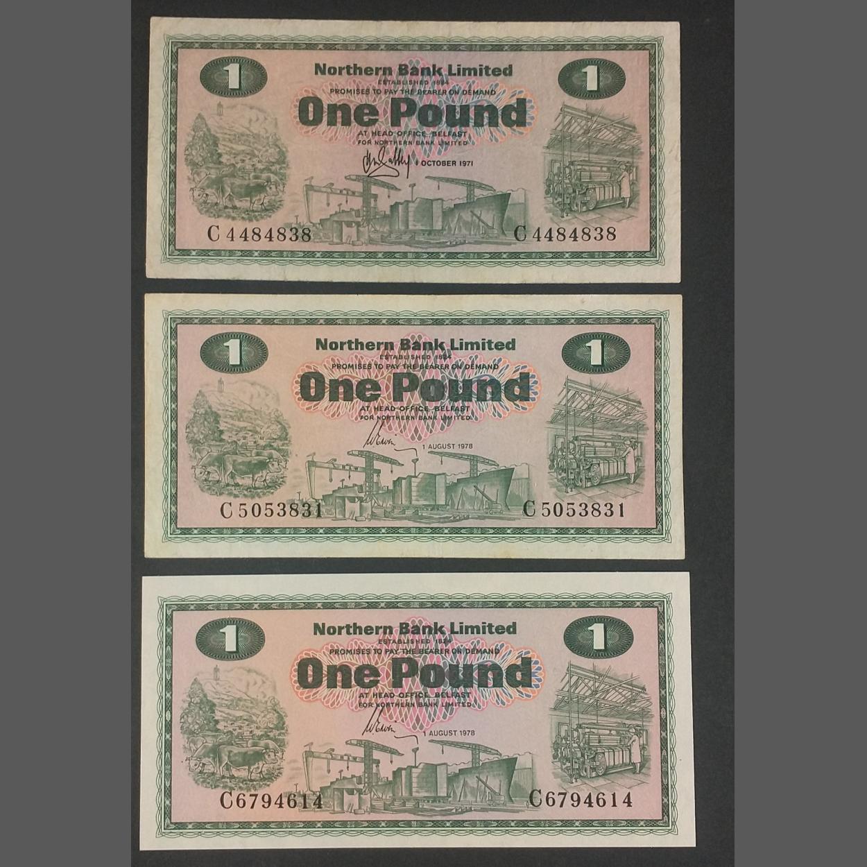 Three NORTHERN BANK LIMITED one pound notes from 1971 and 1978. Some slight wear on edges