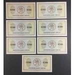 A sequence of NORTHERN BANK LIMITED ten pounds running from E0367806 to E0367808, plus 2 others from 1985 and 1986,