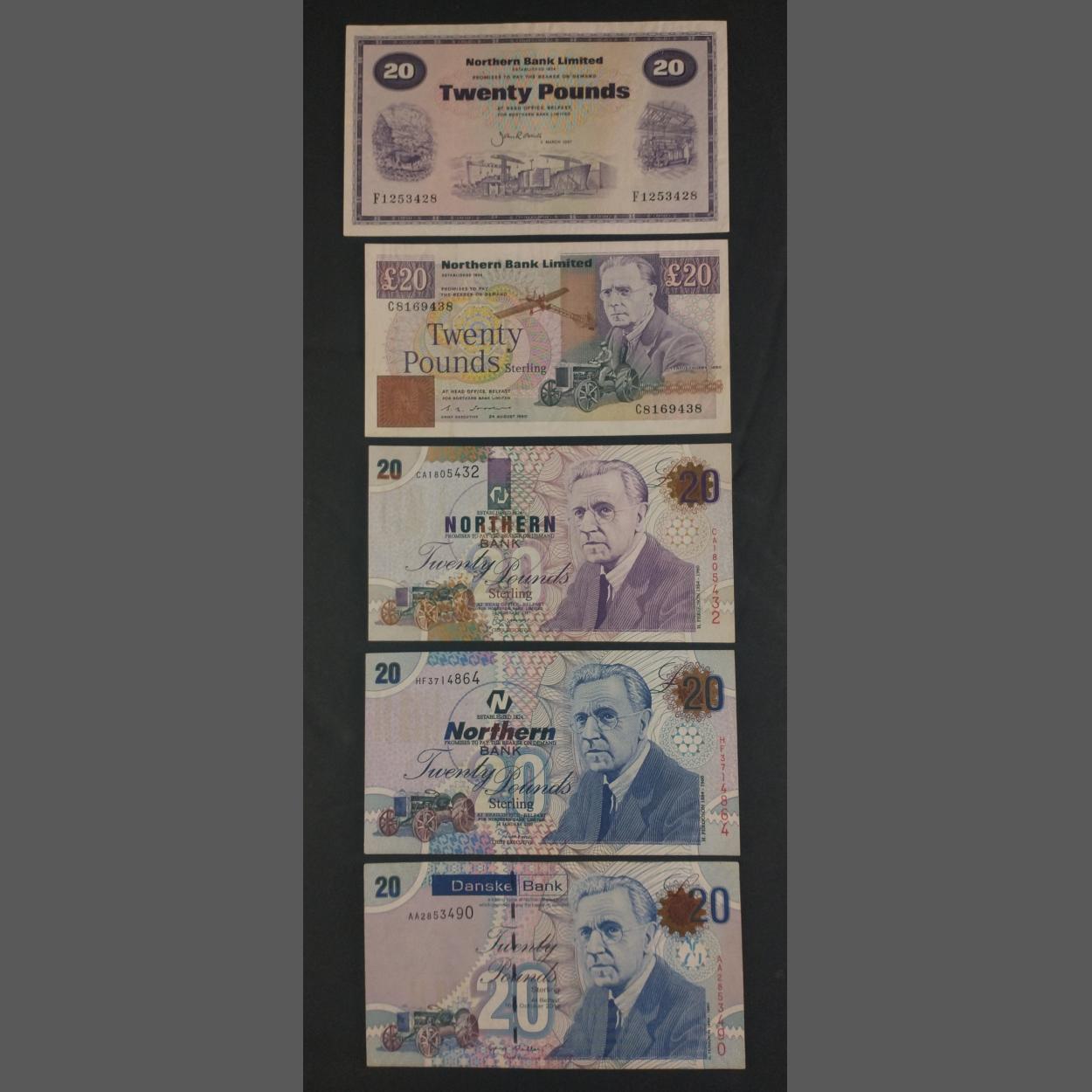 A history of the NORTHERN BANK LIMITED twenty pound note starting in March 1987 (F1253428), August 1990 (C8169438), February 1997 (CA1805432), January 2005 (HF3714864) and DANSKE BANK October 2012 (AA2853490)