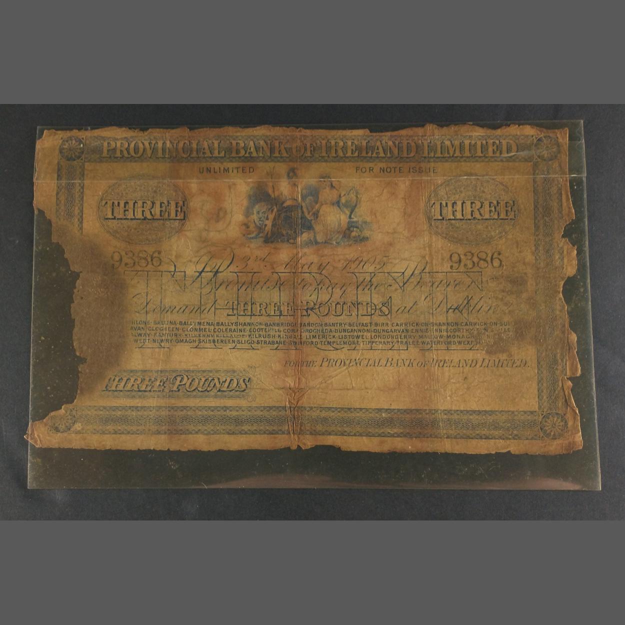 A PROVINCIAL BANK OF IRELAND LIMITED three pound note dated 3rd May 1905 serial no 9386. In poor condition