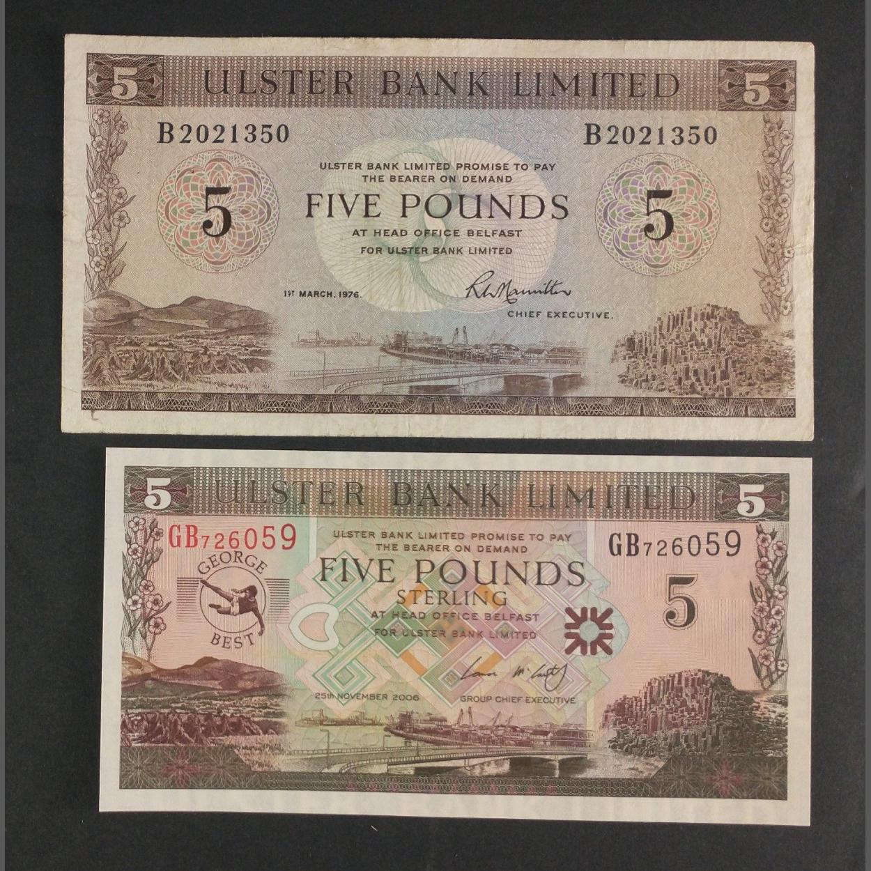 Two ULSTER BANK LIMITED five pound notes from 1st March 1976 and 25th November 2006.