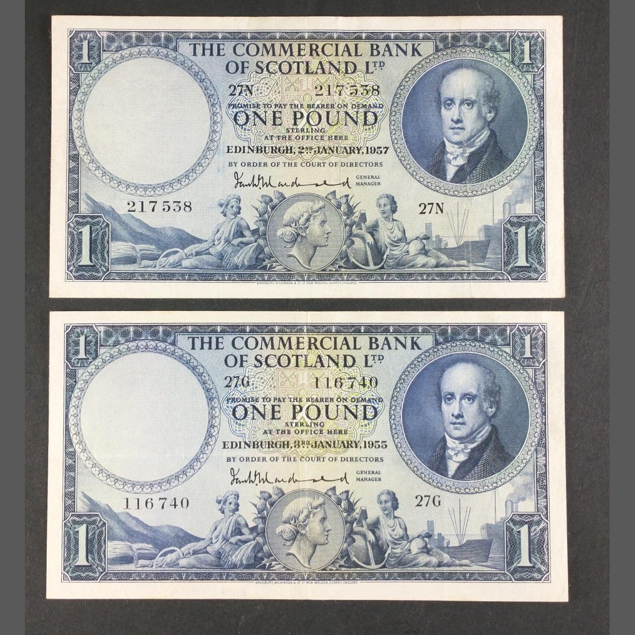 Commercial Bank of Scotland £1 blue. 2 Banknotes in good grades. 1955 & 1957