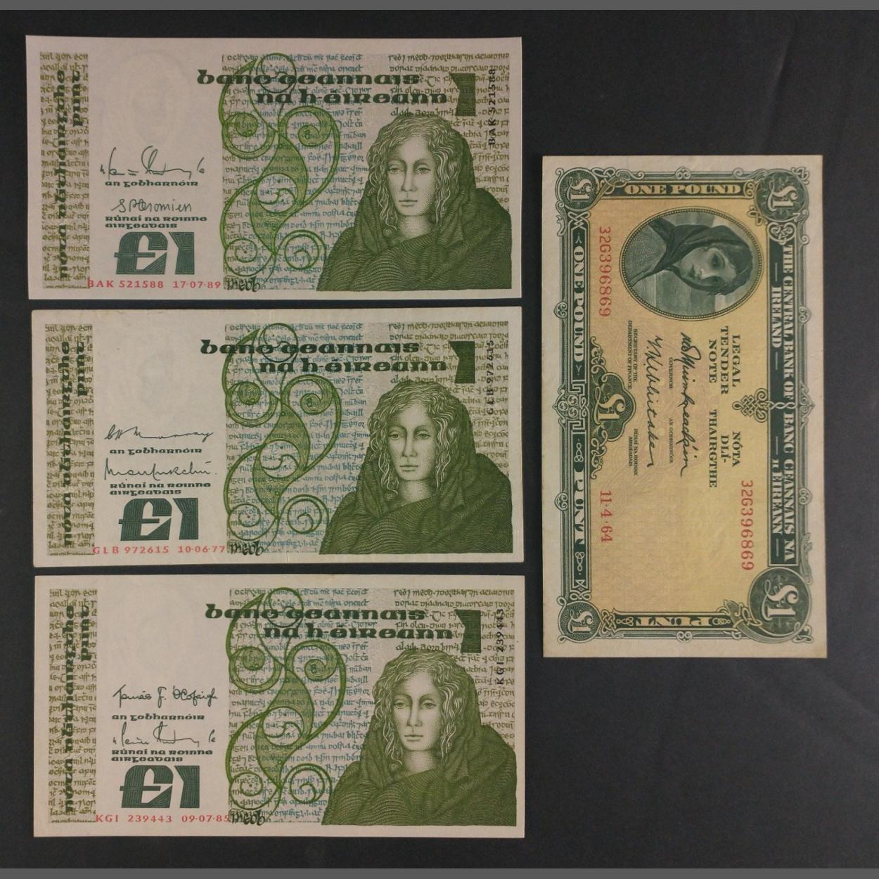 Notes from the CENTRAL BANK OF IRELAND including £1 from 11.4.64 and 3 £1 from 10.06.77, 09.07.85 and 17.07.89. All uncirculated condition