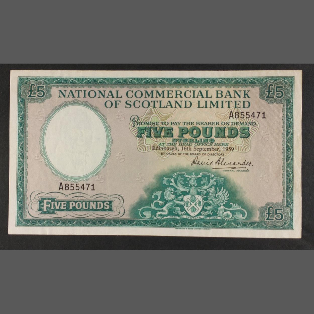 National Commercial Bank of Scotland Ltd. 1959 five pound banknote. A855471 in good grade with light crease.