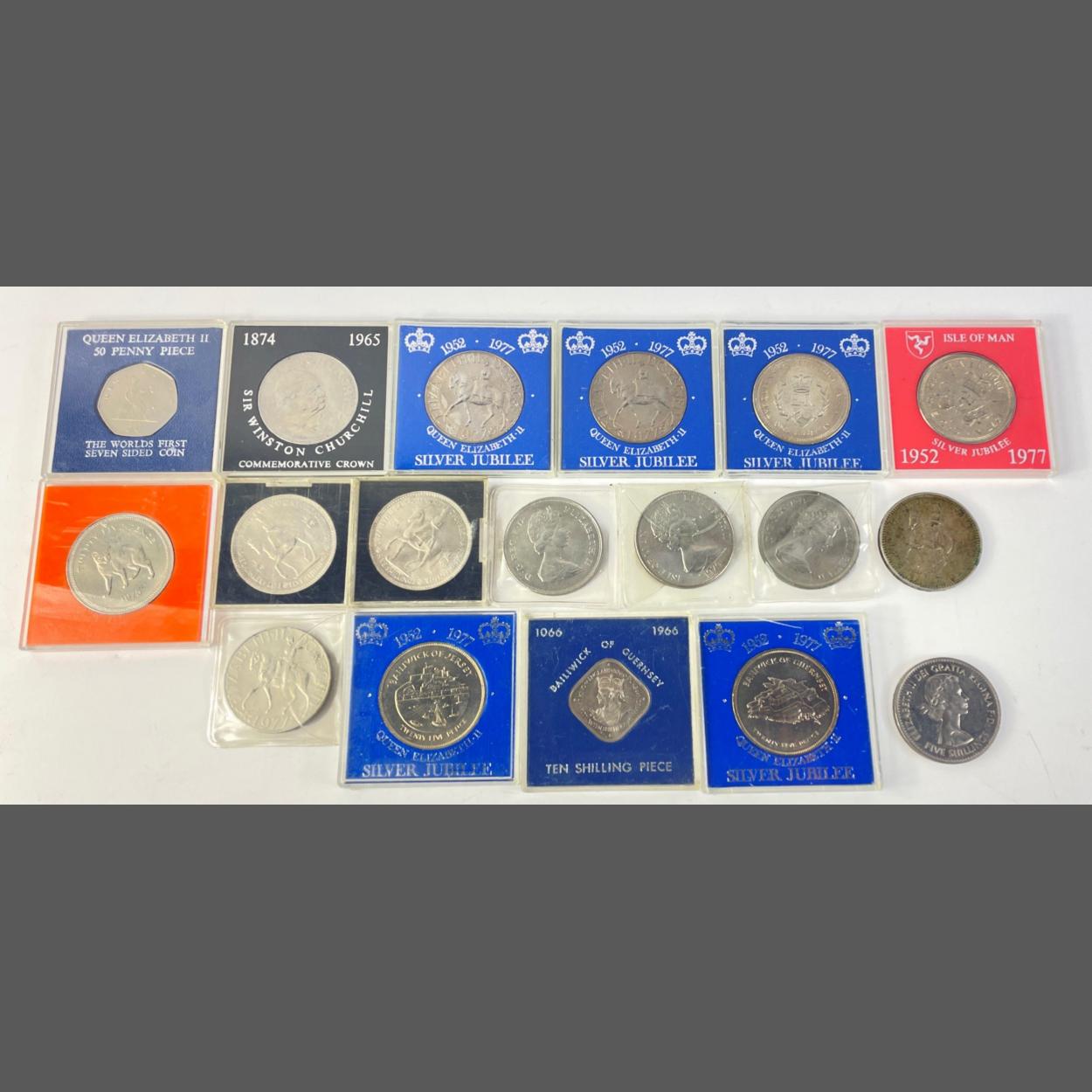 Various cased coins including 3 silver jubilee coins, a QEII 50 pence piece, a Churchill commemorative coin, plus Channel Island cased coins including Jersey silver jubilee, Guernsey ten shilling piece, also Isle of Man silver jubilee, and twenty five pence 1975, plus 4 five shilling coins etc
