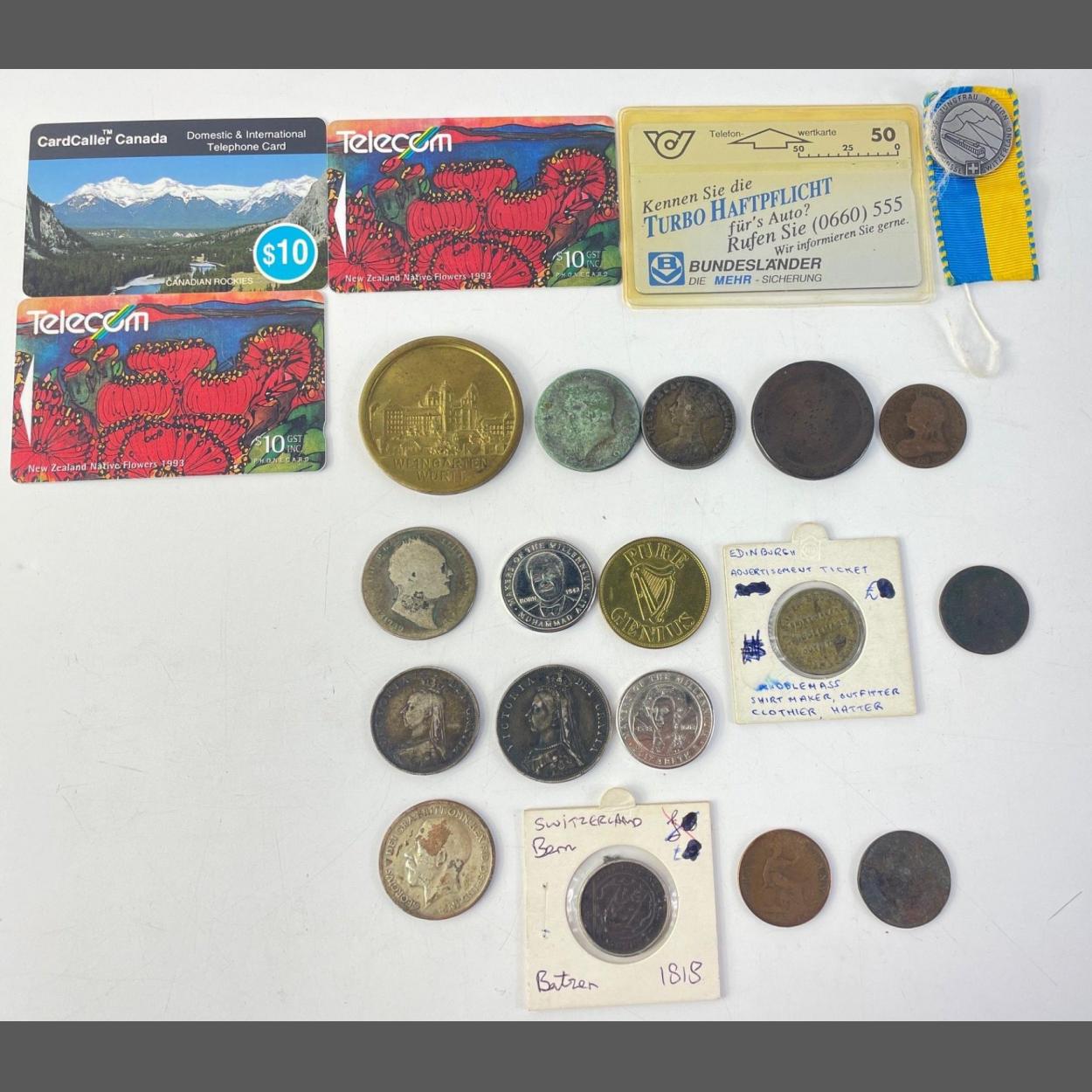 A small lot of coins and items of interest to include 1797 Cartwheel penny with heavy wear. Victoria 1887 Halfcrown heavily toned, 1849 'Godless Florin' with wear but still good detail. An Edinburgh Middlemiss Shirtmaker token. 1818 Swiss Batzen. Includes other coins with wear and some Telecom cards etc.