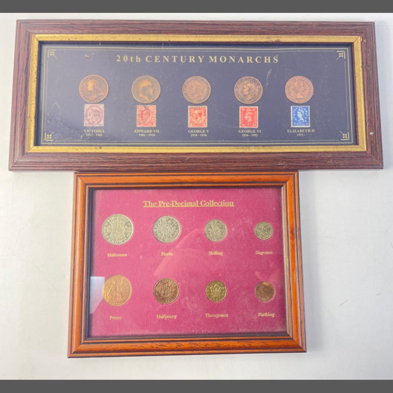 A set of UK pre-decimal coinage in a wooden frame 23x18cm and a framed set of pennies from 20th century monarchs accompanied with a 1 penny stamp from each reign