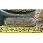 A vintage table top SINGER hand crank sewing machine in wooden case. Interesting older model. Some wear to metal but gilt is still bright. A nice thing !