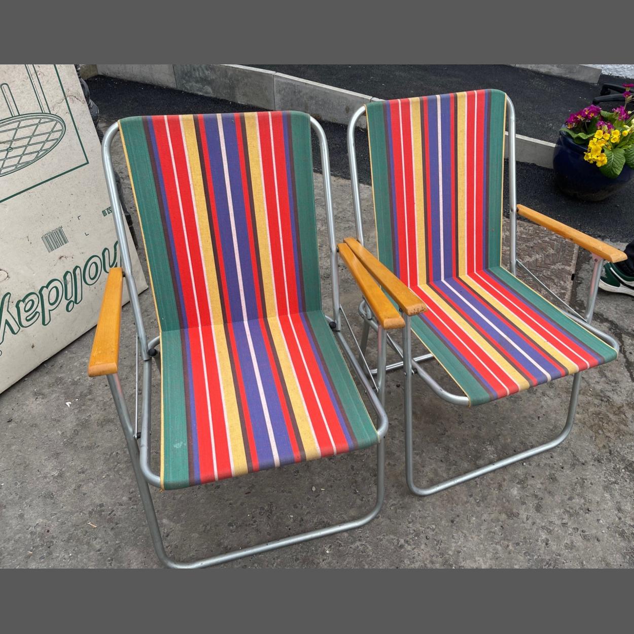 A pair of matching folding striped garden chairs