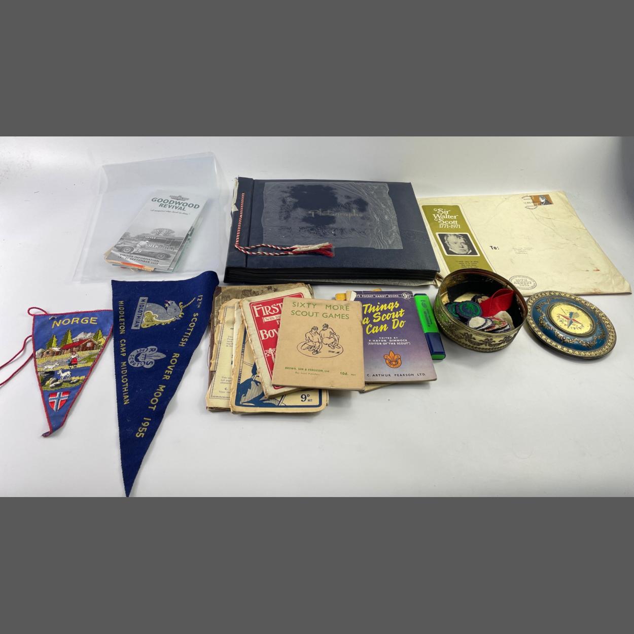 A fascinating photograph album dating from the early 1960s including the Far Eastern voyages of the SS BENDORAN, also Salzburg, tickets and visitor information from the GOODWOOD REVIVAL 2006-2009, plus a 1902 copy of THE SCHOLAR'S SIXPENNY ATLAS in a well-worn condition, and various BOY SCOUTS publications including The Scout's How-To-Do-It Book, Things a Scout Can Do, and First Aid for Boy Scouts also a tin with Girl Guide badges