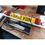 A mixed box to include a wooden framed mirror, rear car trailer light assembly, 2 old car registration numbers, a telescopic camera tripod etc