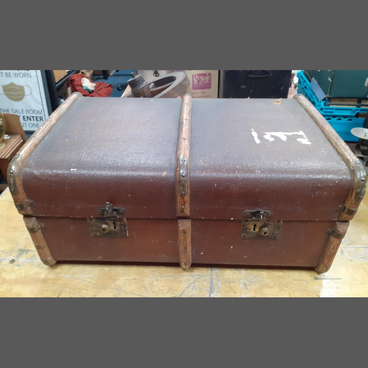 A substantial old pre-war travel trunk with wood banding. 3ft x 18" deep by 14" high approx.