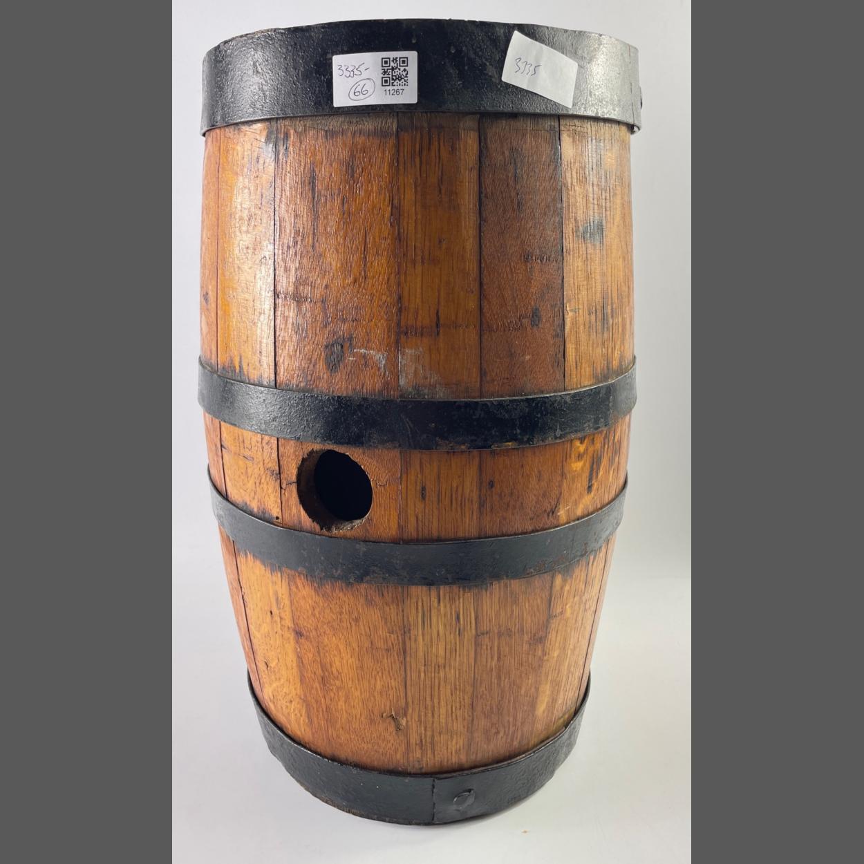A coopered small oak barrel without stopper stands 44cm high, diameter 24cm at top
