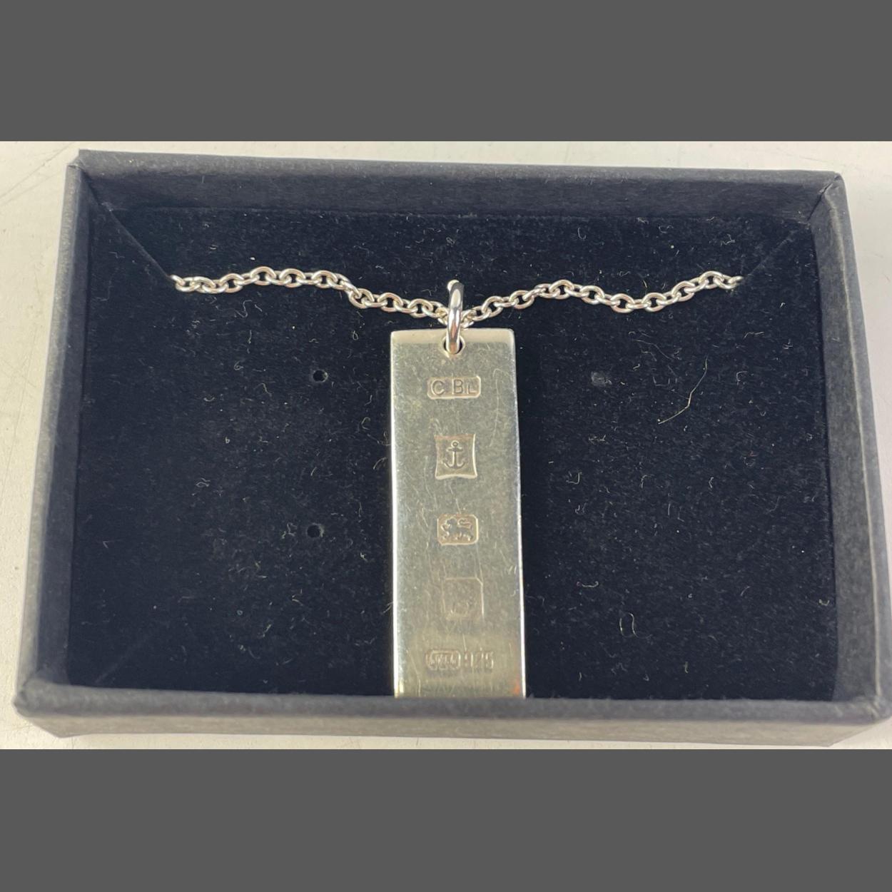 A silver ingot pendant and chain, ingot 3.5cm long, chain 50cm long stamped 925, weight 7g