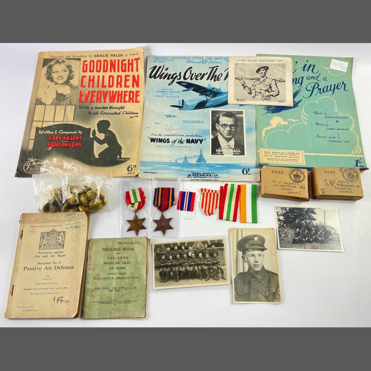 A FANTASTIC WW2 MEMORABILIA collection to include a rare 2nd New Zealand Expeditionary Force Middle East 1942/43 Christmas card, 2 WW2 MILITARY MANUALS - all Arms Record Book named & passive Air Defence 1941 Protection against Gas and Air Raids, 3 x WW2 Sheet music – Wings Over the Navy SIGNED by composer HARRY WARREN, Comin in on a Wing and a Prayer, Goodnight Children Everywhere – Gracie Fields, genuine WW2 photographs card medal box, a genuine Italy Star with Ribbon and Burma Star with Ribbon also various other WW2 ribbons, and 22 various WW2 Royal Navy buttons.