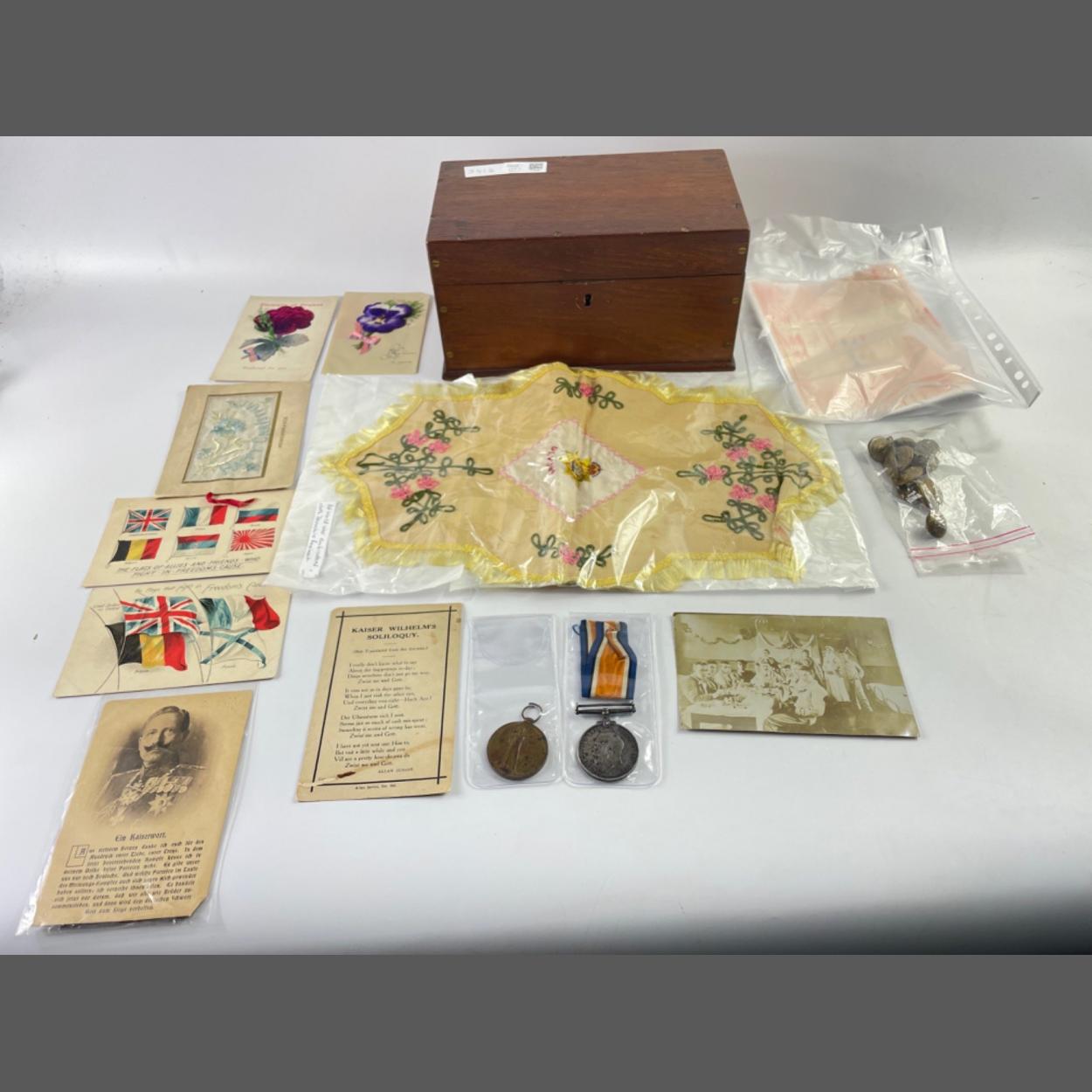 WW1 Collection in vintage wooden box including, WW1 MEDAL PAIR to Private Alfred E. Dye with copies of service, medal & wounded records, a TRENCH ART embroidered WW1 silk cloth with the Regimental Crest of the Devonshires with floral scrolls, 10 x WW1 BUTTONS for various regiments including a “trench art” mounted brooch Royal Scots Greys (Waterloo large button), Prussian/Polish Eagles, RFC/RAF, REME, Royal Corps of Signals etc. and 8 x WW1 postcards including German Kaiser, Joke British Kaiser, 3 Flower cards, hospital card & 2 Allied flag cards (some written).