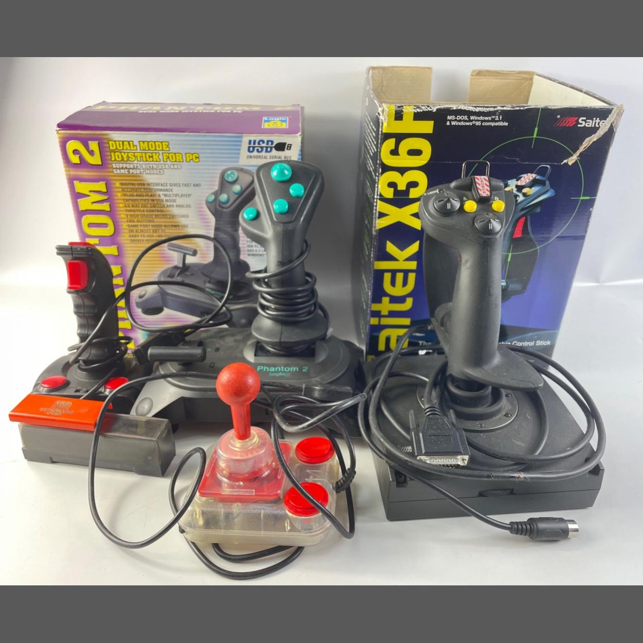 Two boxed joysticks being a SAITEK X36F and a PHANTOM 2
