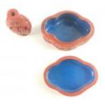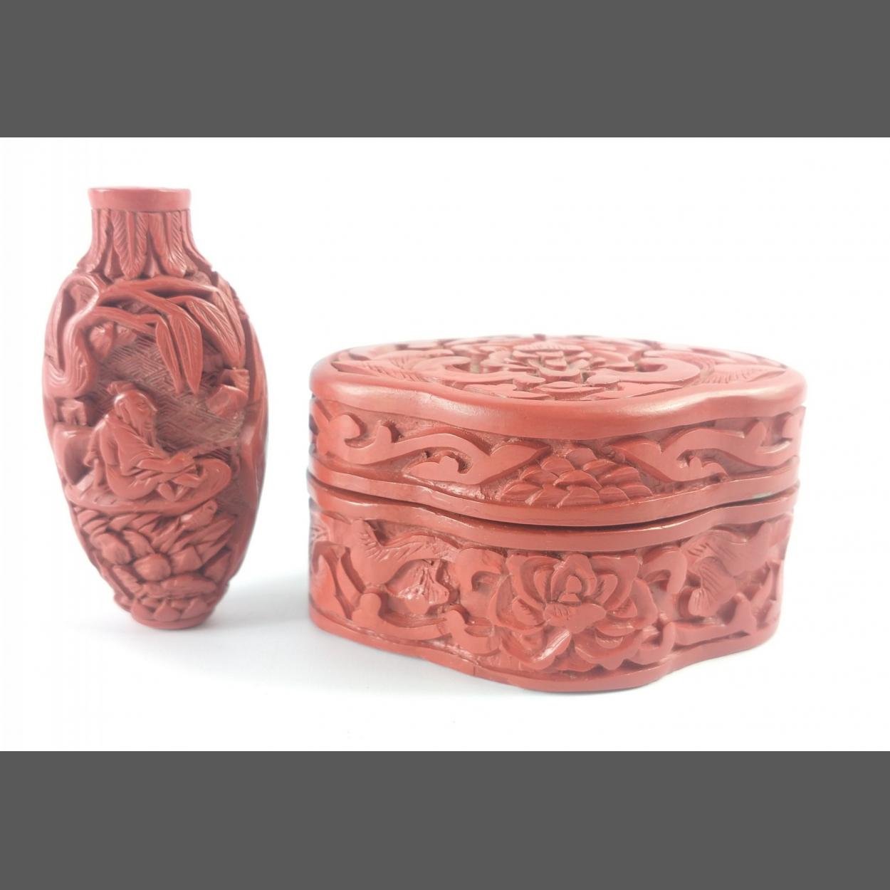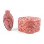 A red coloured snuff bottle (6cm) with carvings of Oriental gentlemen, minus stopper, and a small trinket box with blue enamelled interior (7cm W x 4cm H)