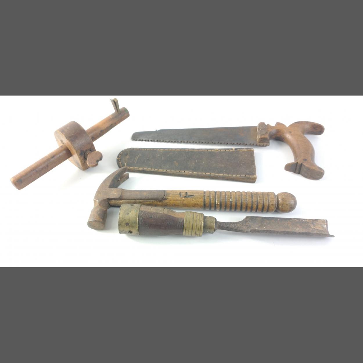 A collection of four old VINTAGE joiner's tools to include a wooden scribe, a wide grooved chisel, an old claw hammer with the letter F carved into the shaft, and lastly a small saw length 32cm tip of handle to tip of the saw, and this comes with its leather sheath