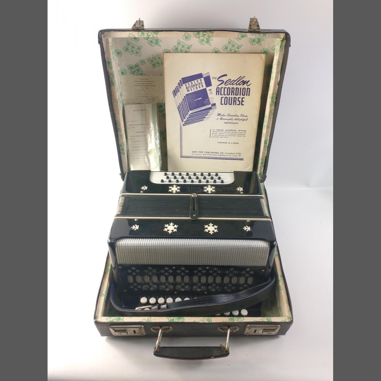 A small vintage Russian button accordian in case. Dated 1974 in lid. Accordian is in lovely useable condition and the case is also good. Bellows appear to be in good order and the accordian appears to work well, no stuck buttons etc.
