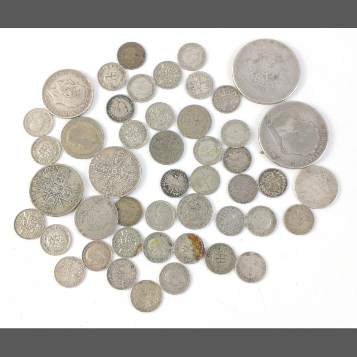 A super little lot of pre-1947 0.500 minimum silver coinage. Includes two heavily worn George III full crowns and a rather nice grade 1918 Florin. Total gross weight 160g approx.