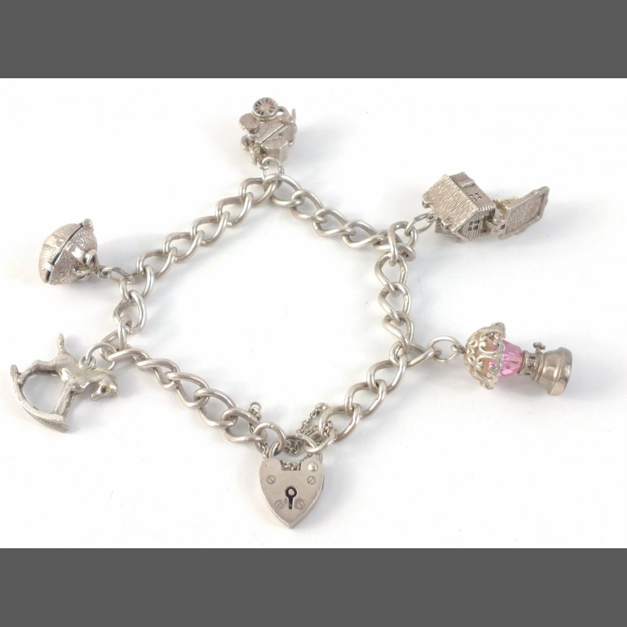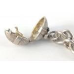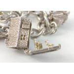 A lovely little sterling silver charm bracelet with some articulated charms. Chain linked are individually stamped. Charms include rocking horse, opening egg with bird inside, a lock, a pram with baby, an oil lamp and a pub with drinkers inside. A lovely little thing. Total gross weight 31.3g