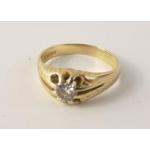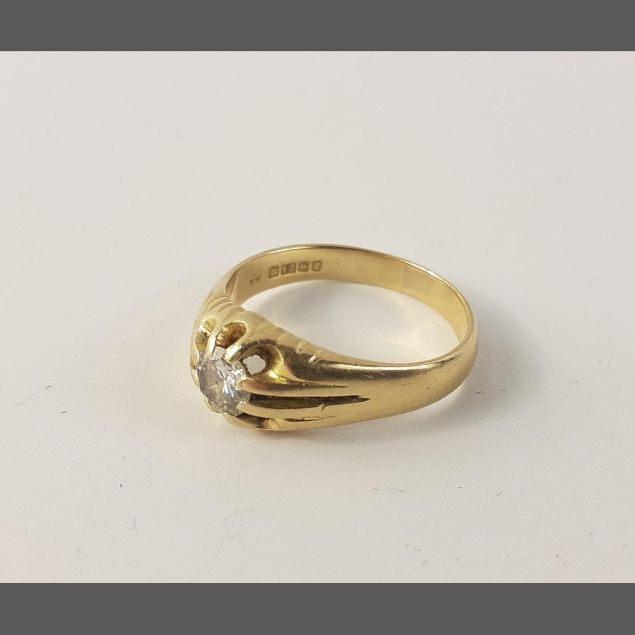 An 18ct marked gold ring with a beautiful round brilliant diamond centre stone. The band is hallmarked Birmingham 1965, Makers stamp WN. Size U. Total gross weight 7.3g The diamond is approx 5mm across and is very clean with one very slight inclusion visible under magnification.