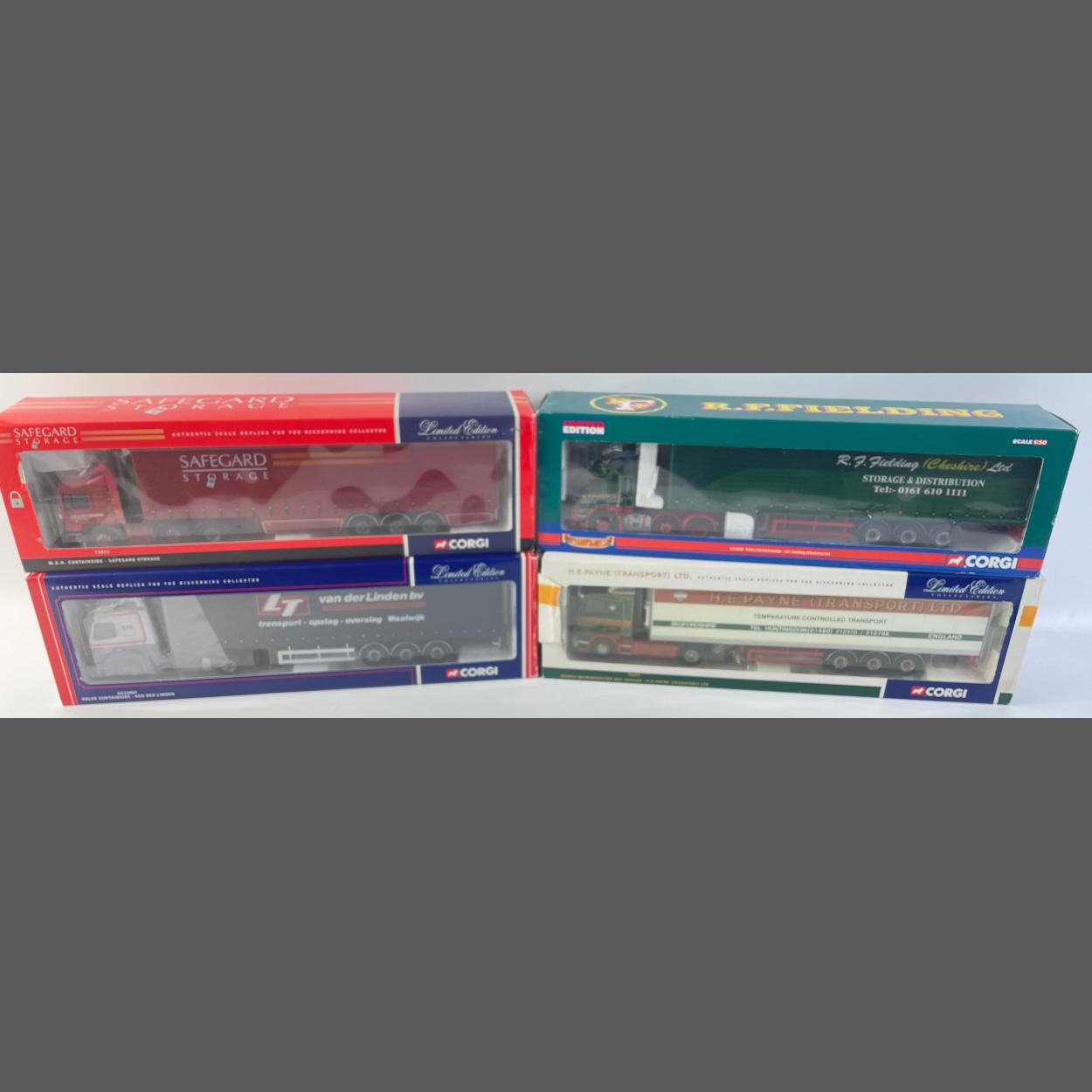 Four CORGI 1:50 Limited Edition collectible lorries includes, CC13507 Volvo RF Feldings, 76601 Scania HE Payne, CC12407 Volvo Van Der Linden, 75805 MAN Safeguard. All boxed complete but may have wear from storage.
