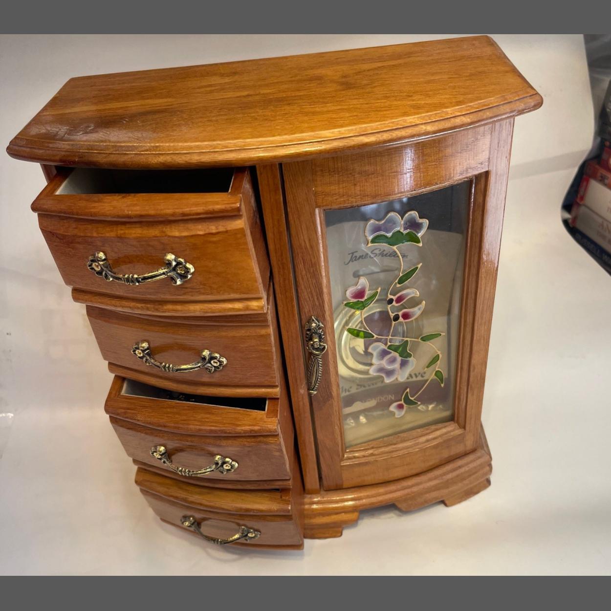A wooden bijouterie dressing table-top cabinet with four drawers and a glazed door - dimensions 28cm tall x 12cm depth x 24cm wide approx - this lot also includes some costume jewellery within etc
