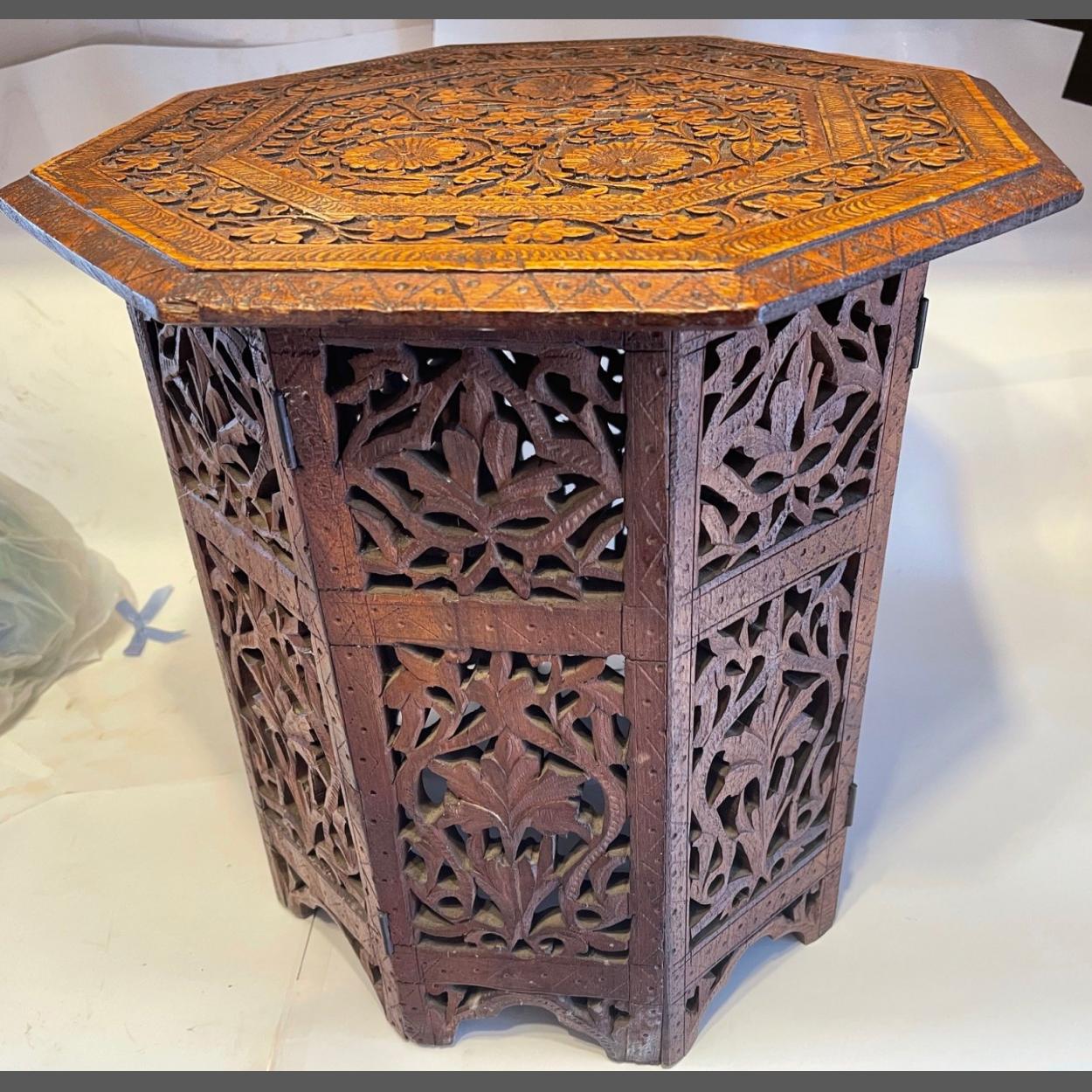 An ornately carved INDIAN folding octagonal sidetable - height 2ft x 18" diameter approx