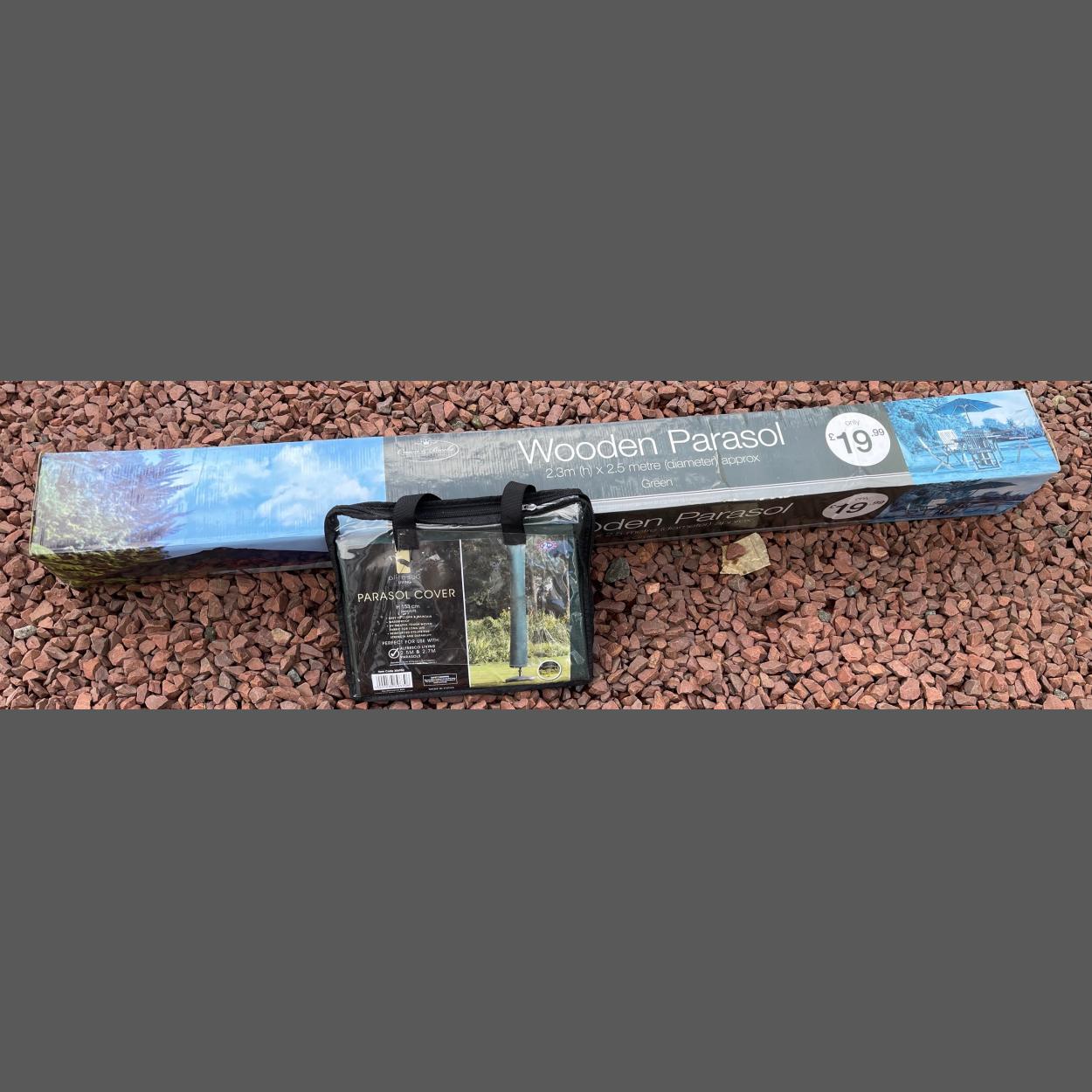 A new boxed green canvas and wooden garden patio parasol with rain-cover for protection of the elements!