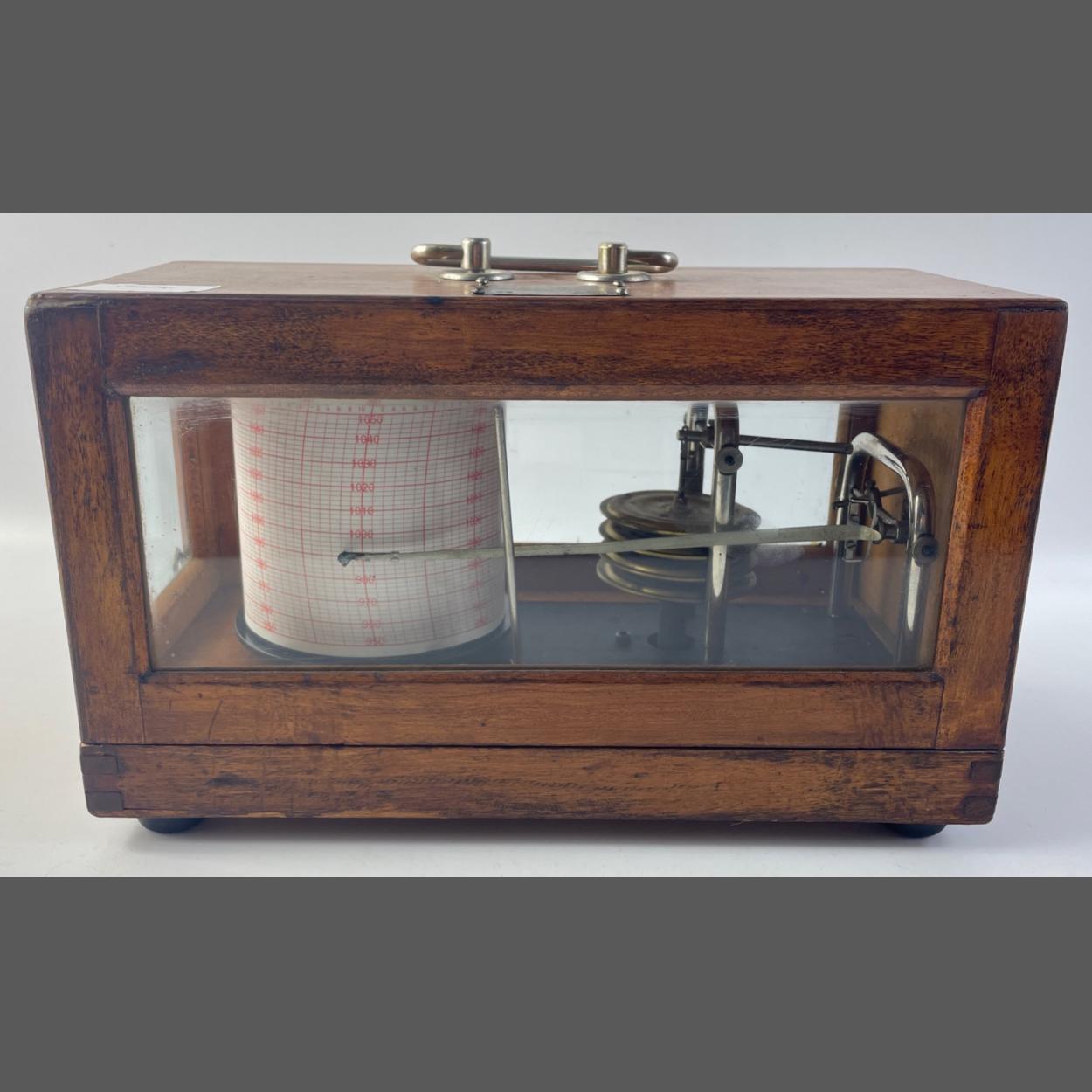 A VINTAGE wooden-cased Marine Mechanical Movement Barograph Barometer No 22005 in lovely condition - 29cm length x 13cm depth x 17cm height - The makers label is on top but indistinct due to tarnishing - a nice example!