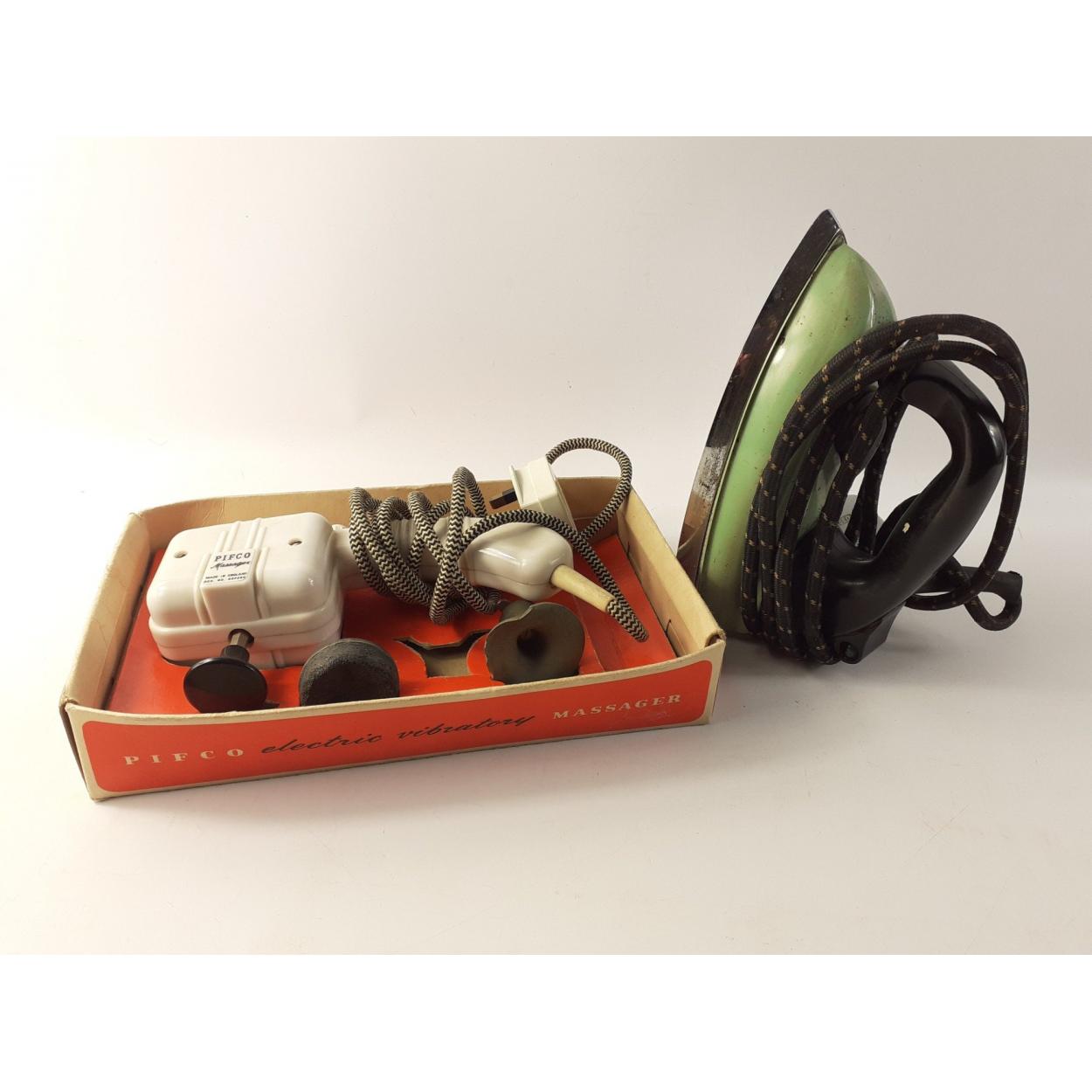 Vintage Electronics. PIFCO Electric vibratory massager in part box and green-bodied Murphy Richards iron