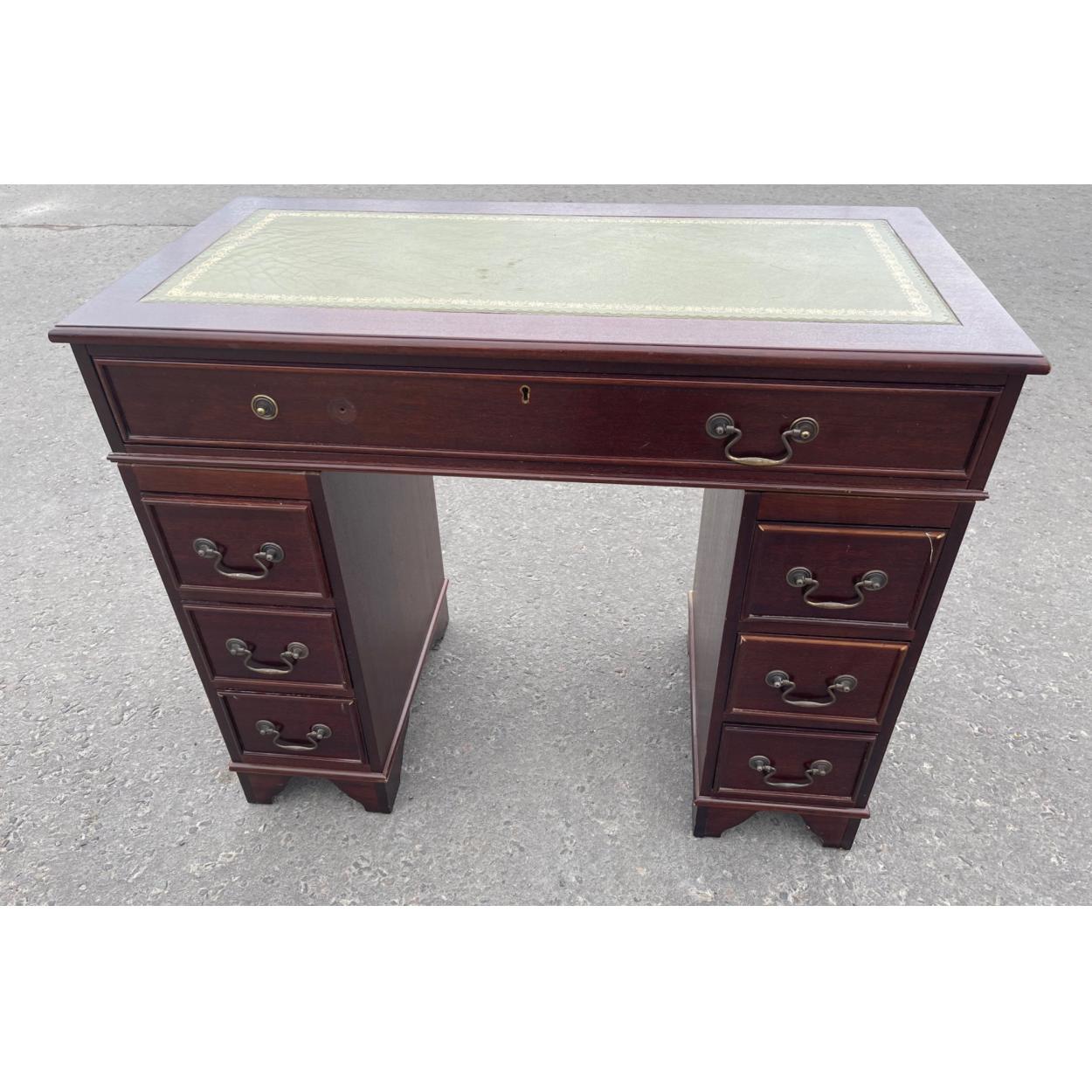 A BIJOU knee hole desk with green leather-effect writing pad and seven drawers - this item dismantles for ease of transport - 4ft width x 2ft depth approx