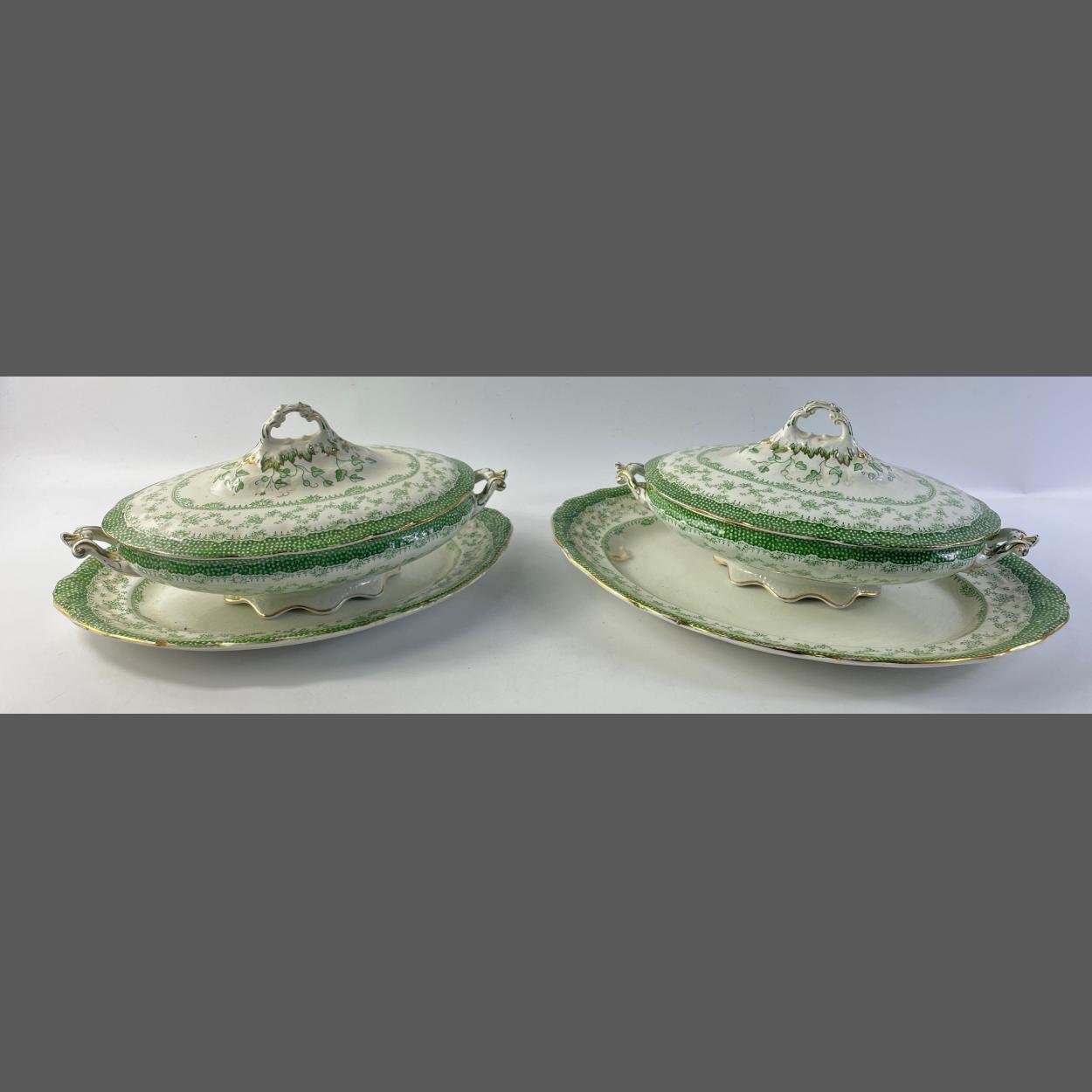 Two nice examples of vintage HERONCROSS 'Lawrence' pattern lidded vegetable tureens on medium sized oval plates - no chips, cracks or signs of damage repair - dimensions each approx plates 37cm length x 27cm width approx and each tureen 30cm length x 20cm width approx - a nice addition to any dining table!