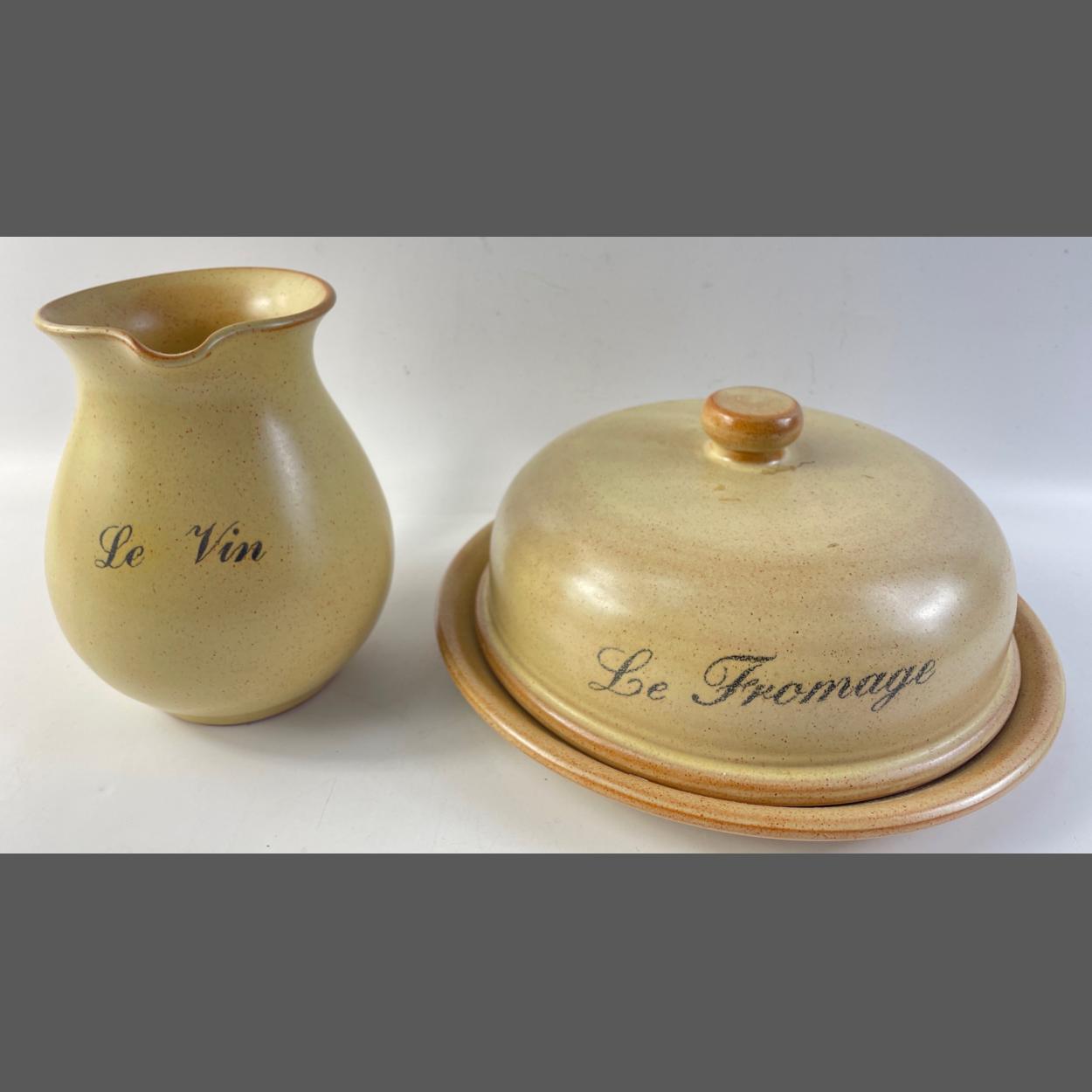 A SUBSTANTIAL DENBY (unmarked) inspired round lidded cheese dish in a wheat/barley colour dimensions 25.5cm diameter x 10cm height approx with a matching FRENCH Le Vin handled jug 16cm height x 11cm diameter at the widest point approx