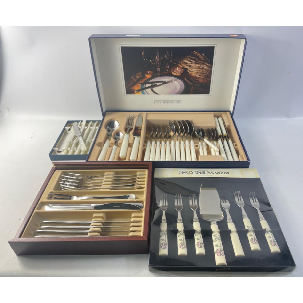 A collection of 3 canteens of CUTLERY with also a small box of vintage MUTUAL branded cutlery stainless steel pearl handed inspired butter knife set of 6