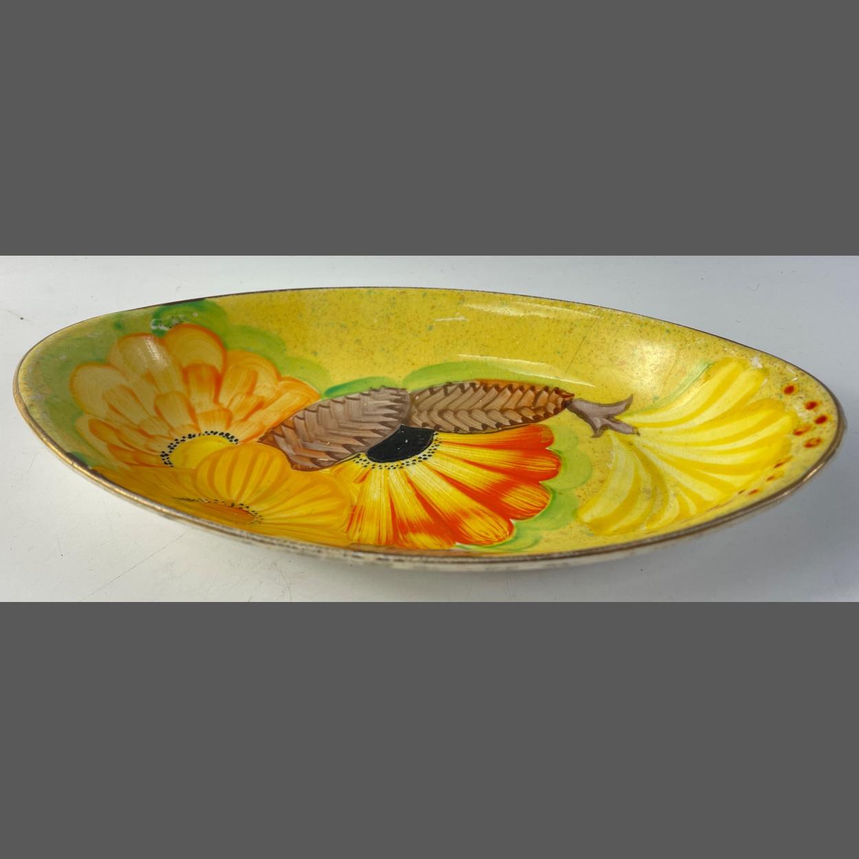 VINTAGE c1930's GRAY'S POTTERY hand painted colourful sunflower and other bright colourful flowers oval dish - 22cm x 13cm approx