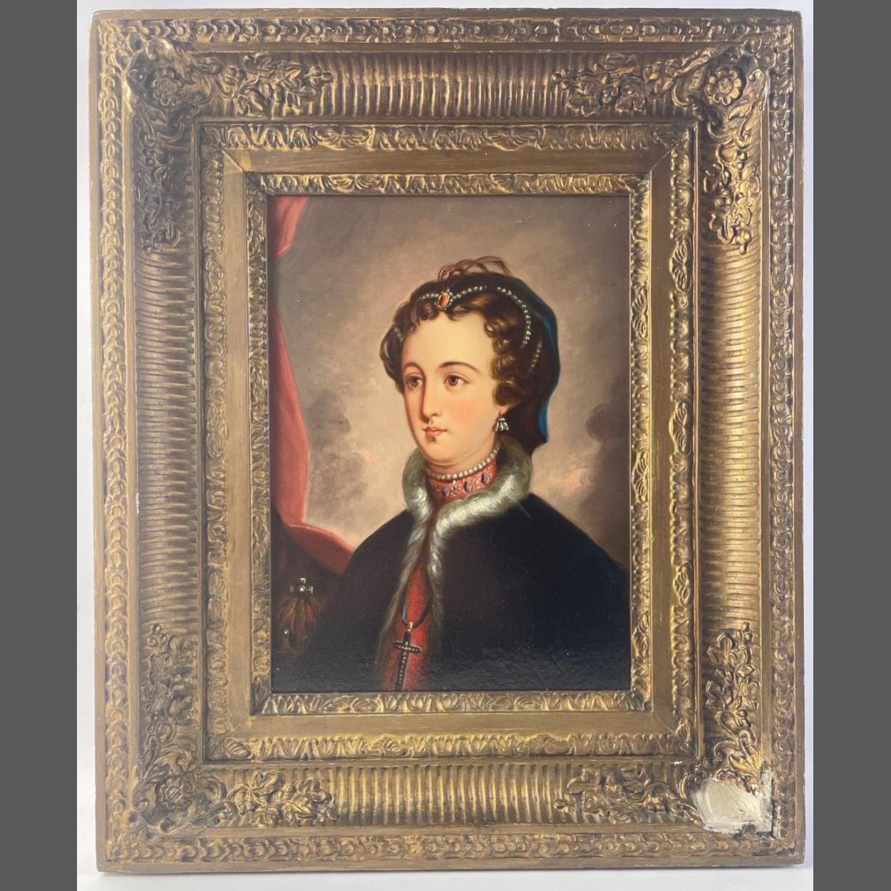 A lovely oil on board presumed to be a stylised image of MARY QUEEN of SCOTS. Unsigned but a very old frame with some damage. Total measurement 45 x 37cm
