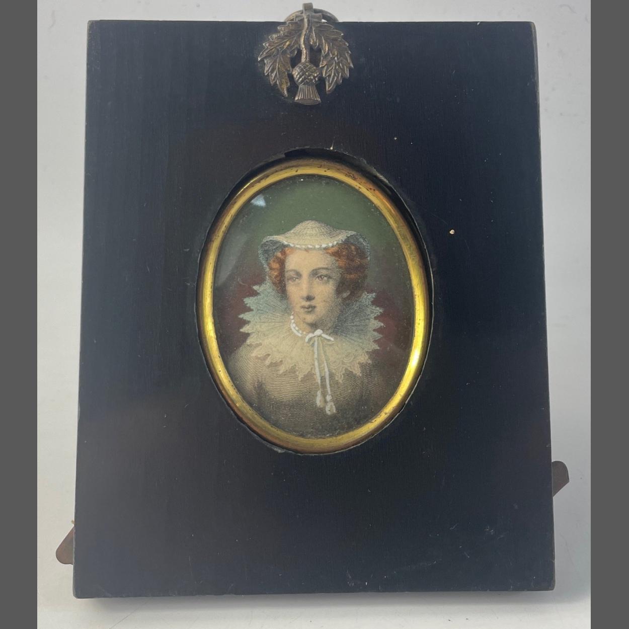 A W. Hay of Edinburgh older reproduction of 1575 Zucchero's miniature painting of MARY QUEEN of SCOTS. Measures 13 x 11cm approx. Label to rear.