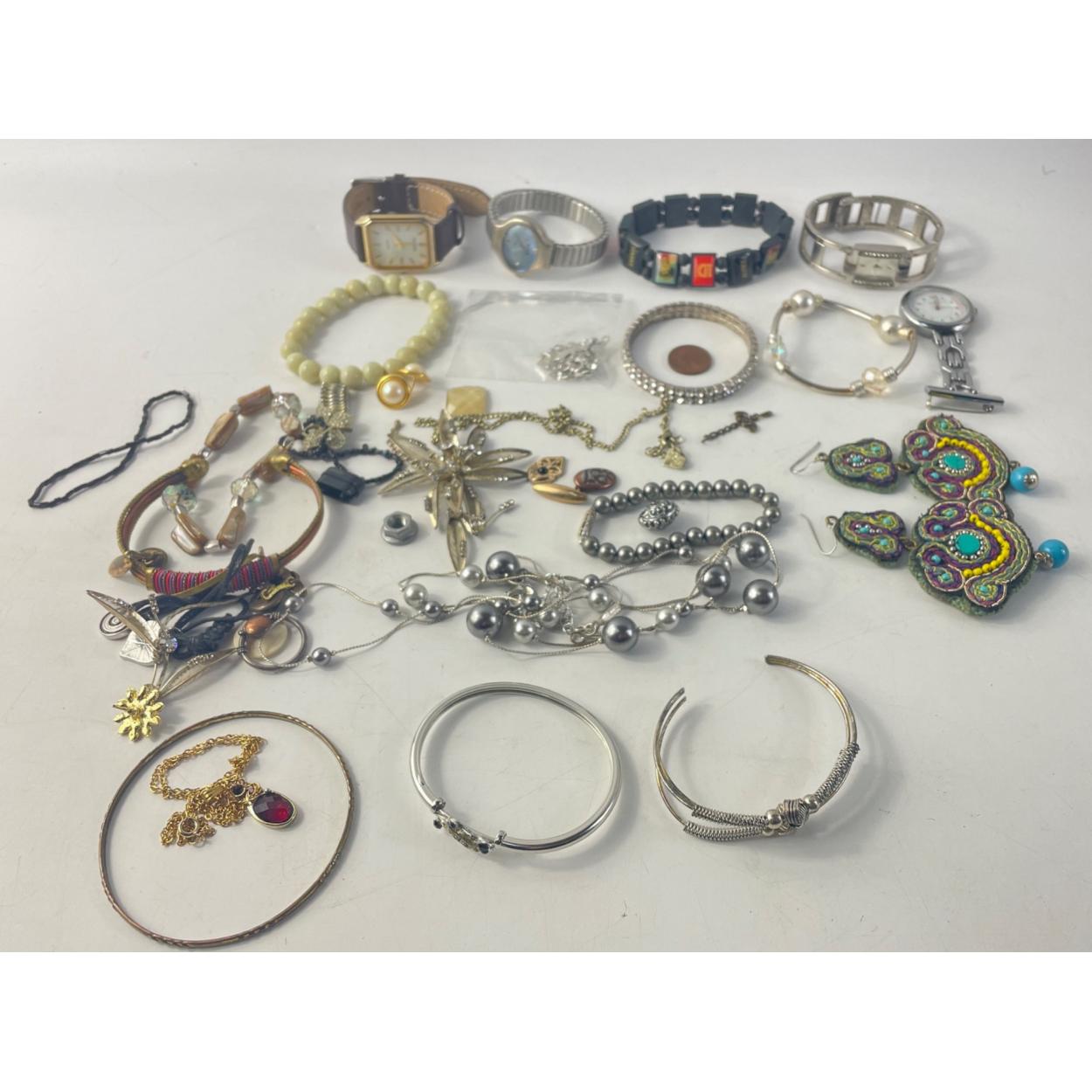 An assortment of costume jewellery and dress watches to include a ROTARY Nurses watch, SEKONDA quartz and others. An interesting lot